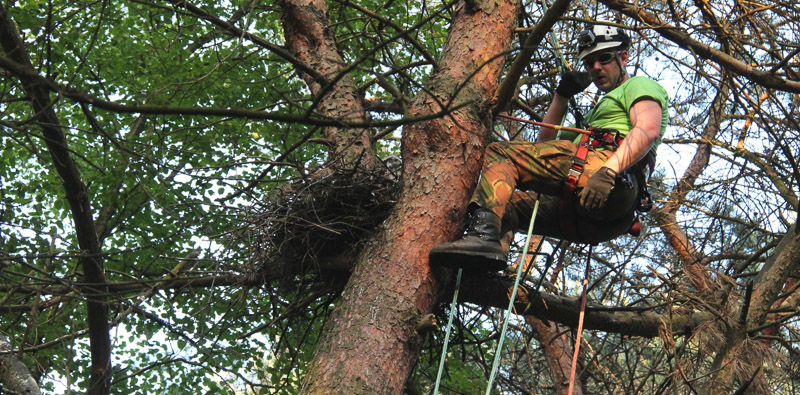 Rik bereikte het nest en kwam er boven uit zodat hij de 3 jongen keurig één voor één in het speciale vervoerszakje kon doen. Daarna liet hij deze voorzichtig met het klimtouw naar beneden zakken, waar de Buizerds door Hans Sybesma werden opgevangen. Nu was het de beurt aan Han Bouman om de vogels te ringen.