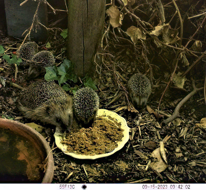 Moeder-egel met zijn jongen die heerlijk aan het smullen was van het egelvoer dat ik daar had neergezet.