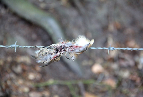 Helaas raken er nog veel vogels verstrikt in prikkeldraad. Op de tweede Pinksterdag vonden Machteld en ik nog een klein “restje” Kerkuil! Doodsoorzaak: verstrikt in prikkeldraad gebruikt als afscheiding van een weiland. Helaas wordt er, naar onze mening, volkomen zinloos, regelmatig prikkeldraad gebruikt als afscheiding van een snelweg of als scheiding tussen weilanden. Hierdoor komen jaarlijks ook veel vogels om: veel TE veel.