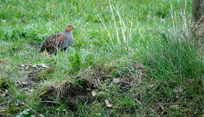 Opeens zag ik in mijn rechterooghoek iets wat me onmiddellijk deed denken aan een Patrijs, dus ben ik de eerste de beste boerenerf opgereden. Machteld had de Patrijs ook in het vizier en maakte gelijk een paar foto’s, maar vanaf de boerenerf was de Patrijs te ver uit de buurt en half verstopt achter paaltjes.