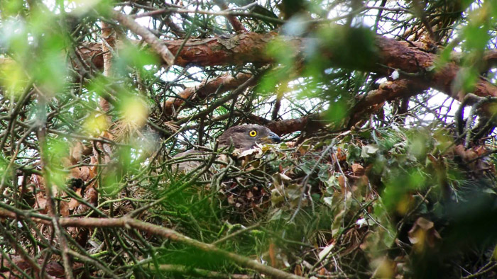 Om de vogels niet te verstoren besloot Gerard het zekere voor het onzekere te nemen en geruime tijd te wachten voordat hij weer bij het nest zou gaan kijken: het nest lag er nog precies zo bij als tijdens de eerste waarneming. Uitgaande van de datum van 20 mei zou er begin juli toch meer duidelijkheid moeten zijn of het hier een broedgeval betrof. Eind juni gingen wij samen het nest controleren. Gewapend met telescoop, kijker en camera naderden we het nest, dat goed verborgen was tussen de bomen en het struikgewas. Op een afstand van ca. 20 meter bleven we staan, op het nest lagen verse looftakken, er kleefden wat kleine donsveertjes aan de rand en met veel moeite konden we een grijze kop met een opvallend, helder geel oog boven de nestrand onderscheiden: het mannetje zat op het nest! Stil observeerden we de vogel, die rustig op het nest bleef zitten. Op het moment dat we stilletjes weg wilden gaan, streek het vrouwtje Wespendief neer in een boom naast de nestboom, even bleef ze zitten en vloog toen weer weg. Opgetogen verlieten we de plek, zoiets maak je niet dagelijks mee.