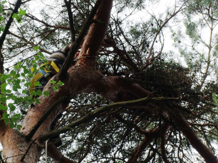 Ook nu lagen er verse berkentakken op het nest en waren er wat meer donsveertjes te zien. Ons volgende bezoek op 15 juli leverde geen nieuwe informatie op: er wordt gebroed maar of er jongen zijn of niet, is niet duidelijk. Gezien het tijdsverloop zouden de eieren al uit moeten zijn gekomen. Tijd om een expert te raadplegen: Gerard belde met Rob Bijlsma, dé roofvogelkenner in Nederland. Deze adviseerde om bij het nest te klimmen, in dit al gevorderde stadium van het broeden zal het de vogels niet verstoren en is meteen duidelijk wat er aan de hand is. Wim Koldewee, de man die al jaren bij de roofvogelnesten klimt wanneer de jonge vogels worden geringd, was direct bereid om te klimmen en op 17 juli was het zover. In spanning keken we omhoog, wat zou Wim aantreffen in het nest, dat op 15 meter hoogte op een kromme tak van de grove den was gebouwd.
