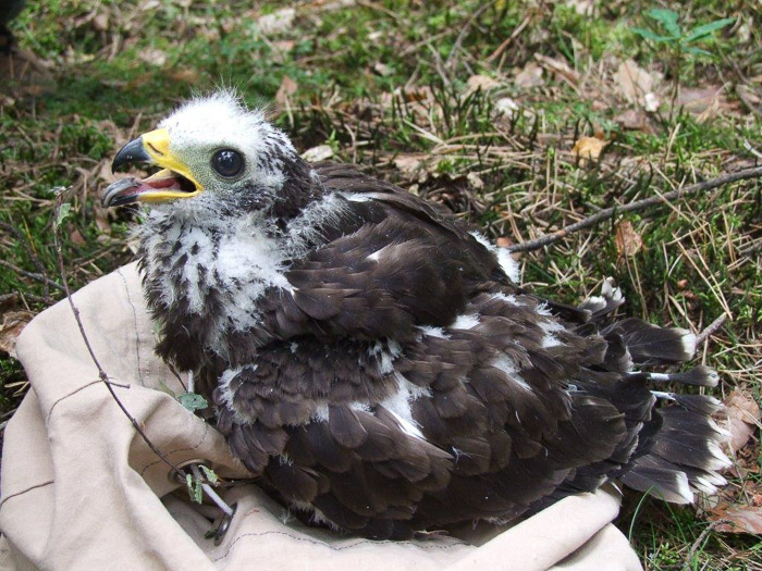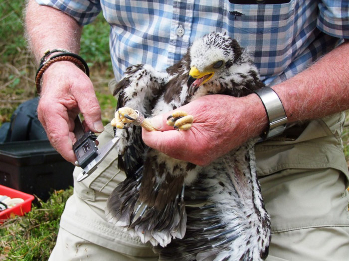 Terwijl alle gegevens verzameld en genoteerd werden, vloog een van de oudervogels een rondje boven het bos. Nadat we nog een paar foto’s hadden gemaakt, werd het jong snel weer terug gezet in het nest, tijd om de rust te laten weerkeren. Het niet uitgekomen ei werd voor onderzoek meegenomen.