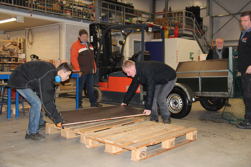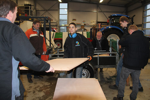 De aanwezige jongens hielpen vanmorgen allemaal enthousiast mee met het afladen van de planken van de aanhangwagen.We zullen de voortgang van de productie van de Steenmartervrije kasten met enige regelmaat in beeld brengen door middel van het maken van foto’s met een verslagje erbij dus: wordt vervolgd in 2015.
