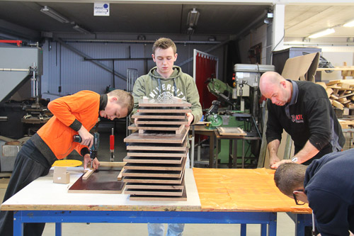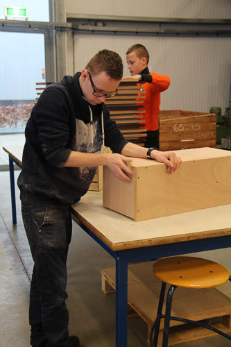 Ondertussen zijn de leerlingen van het ATC druk aan het werk met het maken van steenmartervrije nestkasten. Vanmorgen heb ik een kijkje genomen bij het ATC om te zien hoever de nestkasten al gevorderd zijn. Tot mijn grote verbazing zijn ze al bezig met de afwerking! Daar had ik echt nog niet op gerekend! De jongens waren tijdens mijn aanwezigheid zeer zorgvuldig en geconcentreerd bezig met het afwerken van de nestkasten onder leiding van leerwerkmeester Frank Wopken. Iedereen heeft zijn eigen taak bij de werkzaamheden.