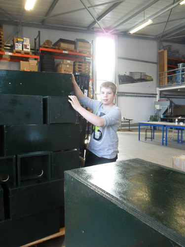 Han en Mieke Bouman waren ook van de partij. Han had een blik verf meegenomen voor de jongens zodat ze de laatste kasten kunnen verven. De buitenkant van de kasten worden groen gemaakt. “Normale” verf is niet geschikt voor de kasten, omdat er dan geen vochtwisseling met de buitenlucht mogelijk is, daarom brengt Han bussen speciale verf naar het ATC. (De binnenkant van een nestkast verf je nooit! ) Hans Odink verraste ons nog door ons te wijzen op een logo vlak bij de invliegopening. Het ziet er echt prachtig uit: zie de foto’s! Gerbrand, Han en ik verheugen ons op het moment waarop we de kasten kunnen plaatsen. Uiteraard willen we dat samen doen: met de jongens die ze in elkaar zetten en hun begeleider ( s ).