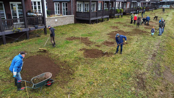 Met harken worden de zoden open getrokken, spaden komen erbij en kruiwagens rijden af en aan. Veel biomassa wordt geruimd en op hopen gebracht. En let wel; het is een puur fysieke gebeurtenis. Een voorzichtig voorstel om het werk met een frees of een verticuteermachientje te doen wordt beschouwd als vloeken in de kerk. De gemeente zal het harksel afvoeren.
