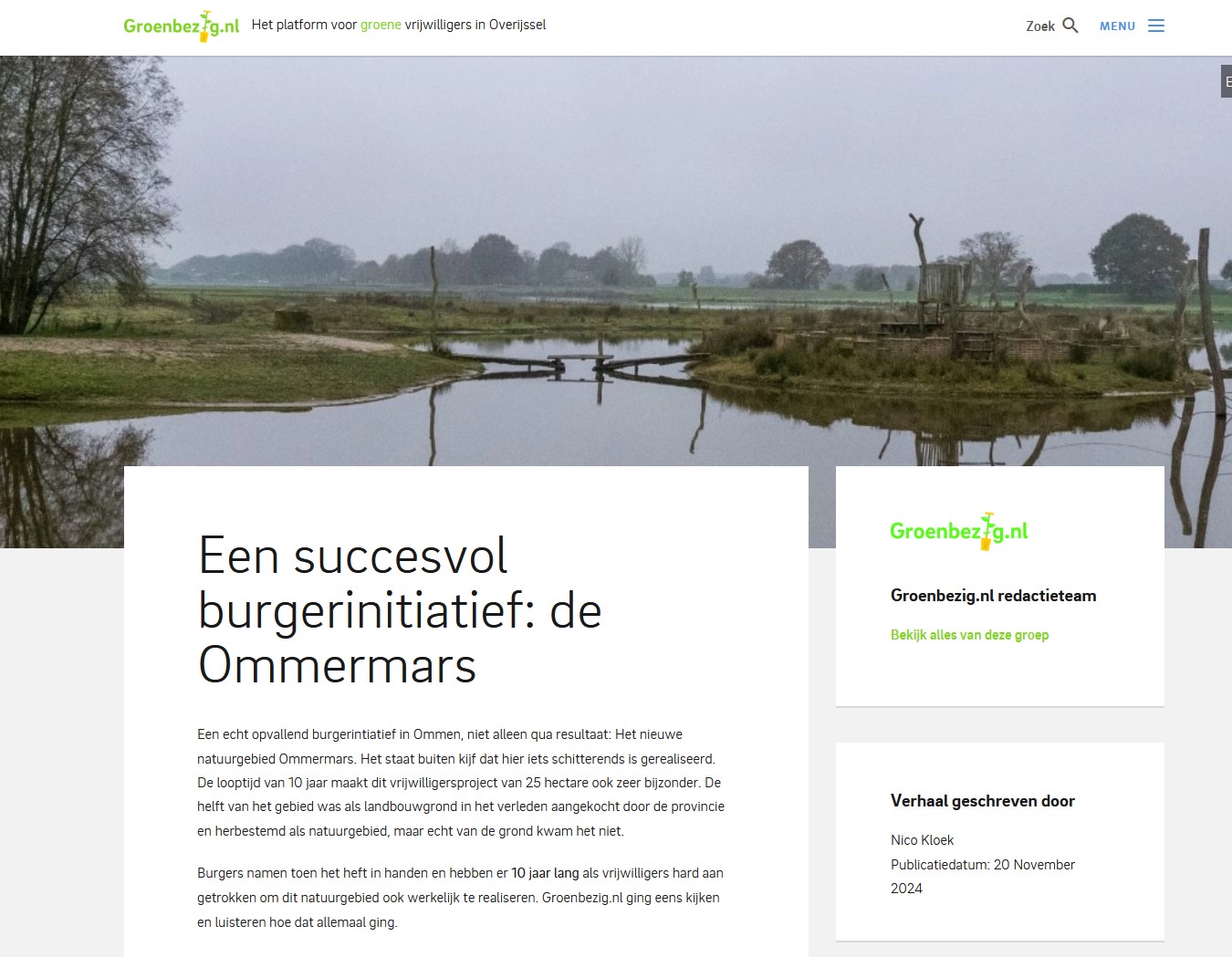 "Een echt opvallend burgerintiatief in Ommen, niet alleen qua resultaat: Het nieuwe natuurgebied Ommermars. Het staat buiten kijf dat hier iets schitterends is gerealiseerd. De looptijd van 10 jaar maakt dit vrijwilligersproject van 25 hectare ook zeer bijzonder. De helft van het gebied was als landbouwgrond in het verleden aangekocht door de provincie en herbestemd als natuurgebied, maar echt van de grond kwam het niet.