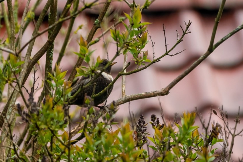 En dat zag ik deze morgen ook: een merel op de rug gezien die zich anders gedroeg dan normaal. En toen zij zich omdraaide zag ik een witte bef: het was onmiskenbaar een beflijster! Na haar een tijdje geobserveerd te hebben vloog ze weg omdat er een gaai aankwam. Na een uurtje zagen we aan de zijkant van het huis opnieuw een beflijster alleen nu het mannetje.