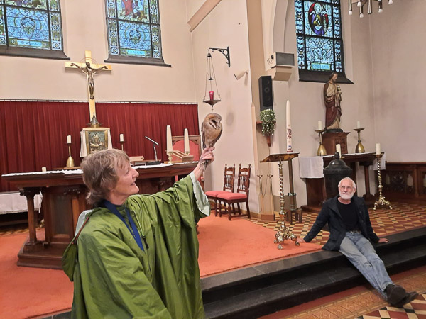 Onder het toeziend oog van de koster toont Ella de in de kerk geringde kerkuil