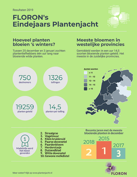 FLORON en Tuintelling.nl vroegen plantenliefhebbers om tussen Eerste Kerstdag en 3 januari een uur te gaan wandelen of in de tuin te kijken naar bloeiende planten. Deze Eindejaars Plantenjacht werd voor het zesde jaar georganiseerd. Deelnemers vonden gemiddeld 14,5 plantensoorten per telling, maar sneeuwklokjes en andere voorjaarsbloeiers lieten het dit jaar afweten.