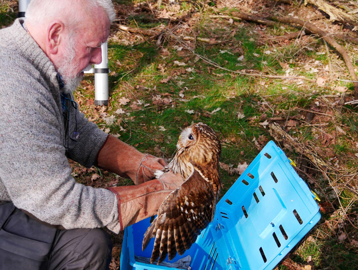 Han heeft besloten de uil op de eerste lentedag van 2019 zijn vrijheid terug te geven op Landgoed Eerde. Han haalt de uil voorzichtig uit de vervoerskist.