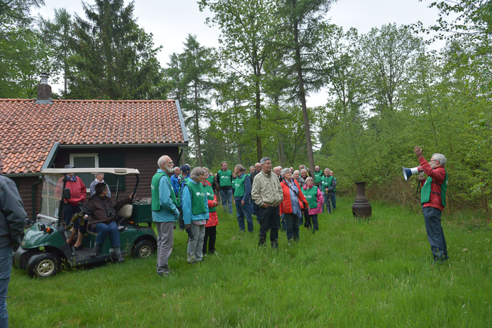 Na een PowerPointPresentatie mochten alle aanwezigen een hesje aandoen met daarop trots 'Landgoed Den Woesten Heide' en trok de hele groep (gelukkig was het droog geworden) achter Wim aan door het bos van het landgoed. Met een megafoon kon hij iedereen mee laten genieten van wat hij te vertellen had over het landgoed. Verhalen over de mensen die er gewoond hadden en over de natuur. De interessante avond werd met een drankje en het beantwoorden van vragen afgesloten op de deel.