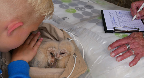 Terwijl de kleinzoon van Willem Havinga, Levi Maasse ( zo opa - zo kleinzoon ) de kerkuilen bestudeert, noteert Mieke Bouman de biometrische gegevens van de kerkuilen.