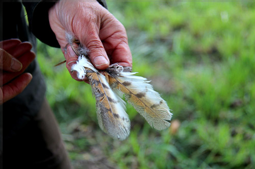 Bij onze vondst waren er nog een paar grotere veren en een flink stuk huid met veertjes zichtbaar, waaruit we konden opmaken dat deze Kerkuil te veel huid verloren had om een dergelijk incident te overleven. We hebben getracht het restje uil los te rukken, maar helaas zat een klein deel overblijfstel veel te vast en moesten we een pluk laten zitten. Nu maar hopen dat dit geen Kerkuil is met een nest, want die kans is natuurlijk groot.