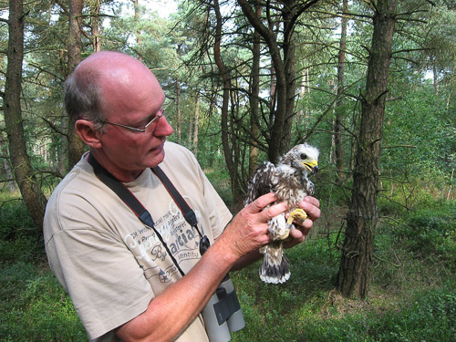 Dat er veel wespen zijn dit jaar is wel te merken wanneer je op het terras zit te eten of te drinken. Ze vormen dit jaar een heuse plaag en zorgen voor veel overlast. Een vogel die wel heel blij is met wespen is de wespendief. Deze zeldzame vogel lijkt sprekend op de buizerd, maar heeft een heel ander leefpatroon. Waar de buizerd muizen en zieke konijnen eet leeft de wespendief hoofdzakelijk van wespen en bijenlarven. De wespennesten worden uitgegraven en de raten worden er uit gehaald en opgegeten. Last van steken heeft hij niet want hij heeft een dik veren pak en wimperharen om zijn ogen te beschermen. in Nederland broeden er ongeveer vijfhonderd paartjes. Het is een trekvogel die uit zuid Afrika laat in het voorjaar aankomt in Nederland. Meestal pakt hij een oud buizerd of kraaiennest om daarin eind mei een of twee eieren te leggen. Op de Lemelerberg heeft dit jaar voor het eerst sinds 2008 weer een paartje wespendieven gebroed en met succes want ze hebben twee jongen groot gebracht. De jonge wespendieven hebben van Han Bouman een ring gekregen van het vogeltrekstation en zijn inmiddels al uitgevlogen. Ze blijven eerst nog een tijdje in de buurt van het nest om wat aan te sterken voor de lange tocht. Ze vliegen richting Zuid Afrika. De jonge wespendieven zijn pas over het tweede of derde jaar geslachtsrijp, waarna ze richting Europa vliegen om te broeden