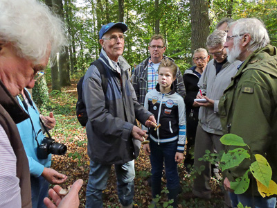 Het was maar goed, dat men zich dit keer voor de paddenstoelenexcursie moest opgeven, anders waren er waarschijnlijk weer te veel deelnemers geweest. Voorgaande jaren kwamen er nogal eens te veel geïnteresseerden opdraven: vorig jaar ongeveer 60 en dat was eigenlijk te veel voor één deskundige paddenstoelenman. Nu waren er zo'n dertig deelnemers én had Bernhard de Vries een paar extra kenners uitgenodigd om assistentie te verlenen.