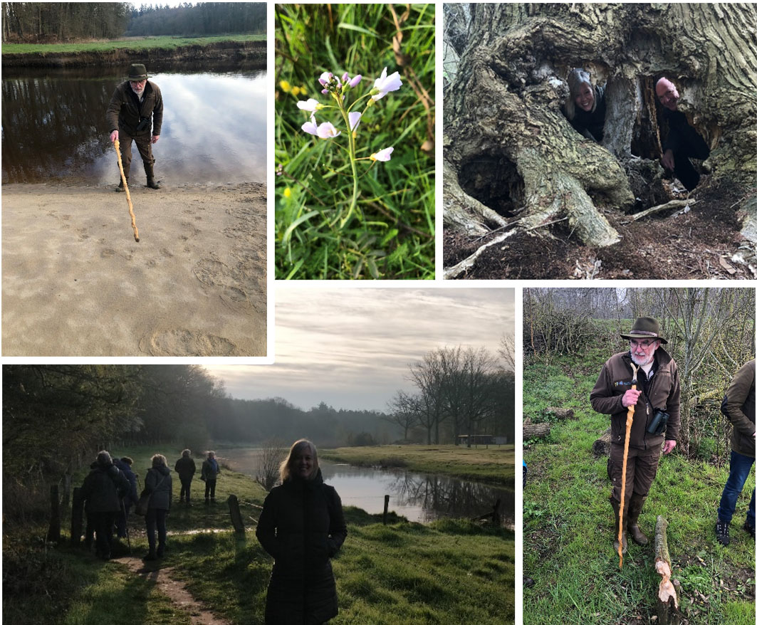 Het enthousiasme van Arend Spijker voor de prachtige natuur werkt erg aanstekelijk. Je gaat echt met andere ogen naar je omgeving kijken. We worden langs de Beneden Regge geleid voorbij een omheining, waar geen mensen komen. Onderweg zien we sporen van een vos, verschillende marters, dassen en plukken haar van rammelende hazen. Het zand aan de oever verklapt door de vele pootafdrukken dat het water vol leven zit (vooral als wij er niet zijn). Nestelende oeverzwaluwen vliegen af en aan. Een geweldig gezicht! Ook spotten we een Zwartkop. We worden verrast door omgeknaagde bomen en vegen van een staart in het zand: het werk van een bever! Zouden we ‘m te zien krijgen? We zijn niet de stilste groep, dus helaas komt het daar niet van. Verschillende verhalen komen voorbij: over de Franse soldaat die in het bos begraven ligt en de dassenburcht die onbewoond is gebleven.