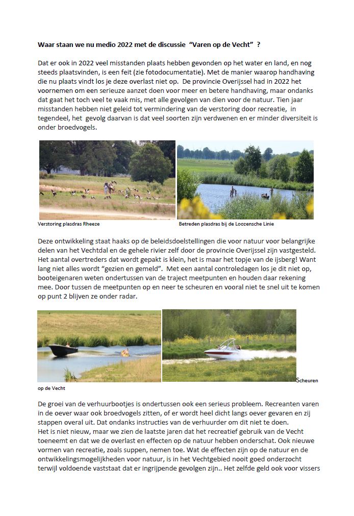 Een van onze leden, Johan Poffers, maakte voor de overheden (provincie , waterschap) een rapport over de effecten van varen op de Vecht voor natuur. Wij zullen dit gebruiken in onze gesprekken over een nieuwe "zonering rust en drukte" in ons Vechtgebied.