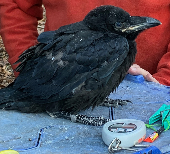 Ook in 2022 konden we de Raven van Junne ringen. Deze raven komen er tot nu toe steeds terug. Donderdag 14 april was het zover. De jongen zijn dan al geen kleine raven meer wat betreft de grootte, maar wel wat betreft hun leeftijd. Het waren ondertussen al flinke vogels, die bijna op het punt stonden uit te vliegen, dus waren we blij dat Wouter Thijs Nijhuis, hovenier Nijhuis Groentechniek, tevens onze vaste “ravennest”klimmer, ze allemaal probleemloos naar beneden kon brengen. Vóór Wouter Thijs ze uit het nest haalde fotografeerde hij snel het nest met de raven in de top van de boom. Het is een prachtige foto geworden welke ik dan ook met veel plezier, met toestemming van Wouter Thijs, in dit artikel mag plaatsen.