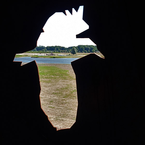 Via het paadje achter de begraafplaats kwamen we op een verhoging bij de meanderende Regge waar vermoedelijk het eerste kasteel Eerde van roofridder Evert heeft gestaan. Aan de overkant was even een ree te zien. Afdalend richting spoorlijn schrokken 2 dames van de uitstraling van Arend en probeerden ze snel hun loslopende honden aan te lijnen. Op meerdere plekken langs de Regge hebben we genoten van een rivier die weer mag meanderen. Oevers slijten uit en storten in, bomen vallen om, zandbanken ontstaan. Stroomversnellinkjes en stilstaand water. Een prachtig stukje natuurbeleving. Je zou er uren kunnen zitten en genieten.