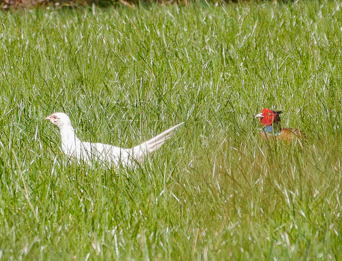 Terwijl wij oplettend zoeken tussen de vegetatie, steekt er opeens een witte kop uit het lange gras achter een aantal bosjes, ongeveer honderd meter bij ons vandaan. Machteld fluistert verbaasd: “Wat is dat”? Ik heb even geen idee: een patrijsachtig iets? Een fazant? Inderdaad, het blijkt een fazant te zijn, maar wel een hele vreemde vogel, namelijk een witte, maar dan zonder rode ogen. Het kost ons moeite het dier te fotograferen aangezien wij achter diverse struiken en tussen het kreupelhout staan… Wij moeten tussen de vele takken door focussen en dan is het wel een kunstje om het dier goed in beeld te krijgen, maar uiteindelijk lukt het toch nog het dier te fotograferen.